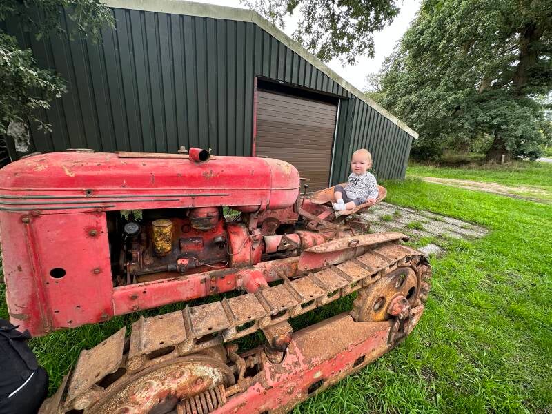 Romée die een grondige inspectie uitvoert aan de cletrac welke we gekocht hebben op HMT in Limburg